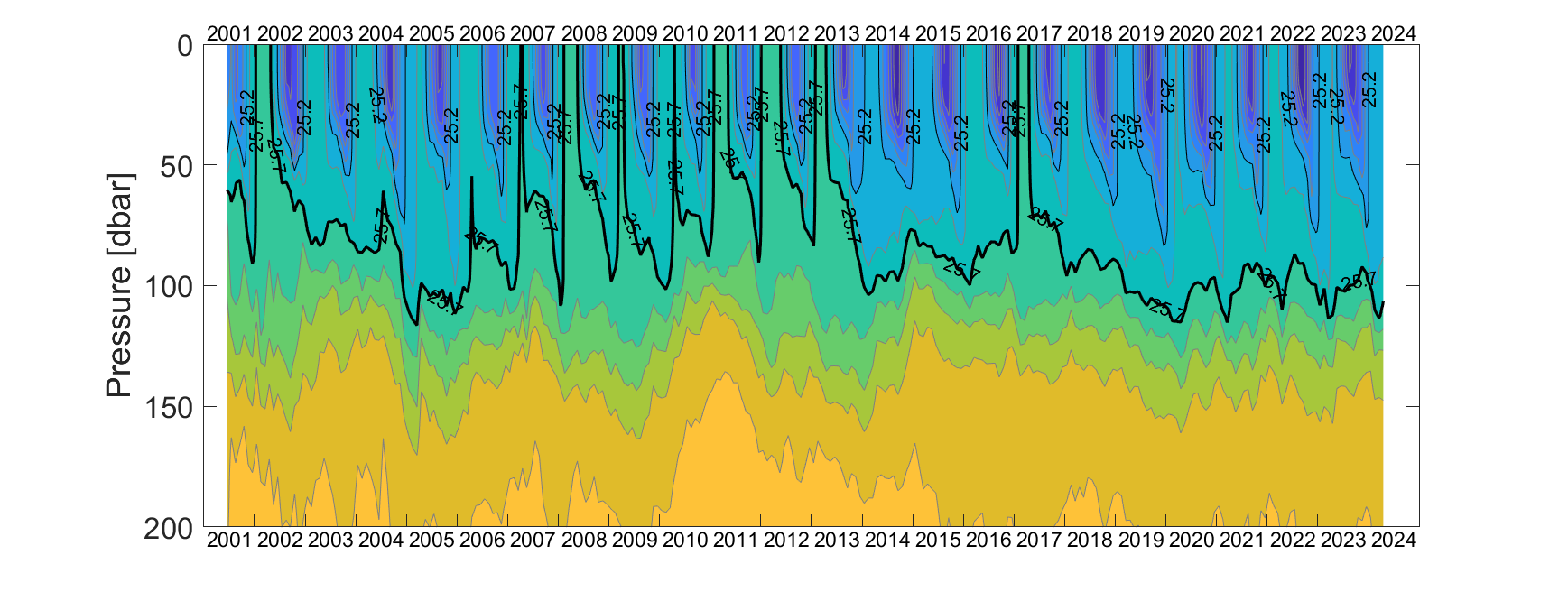 density anomaly (sigma-t [kg/m<sup>3</sup>]) versus pressure and time
