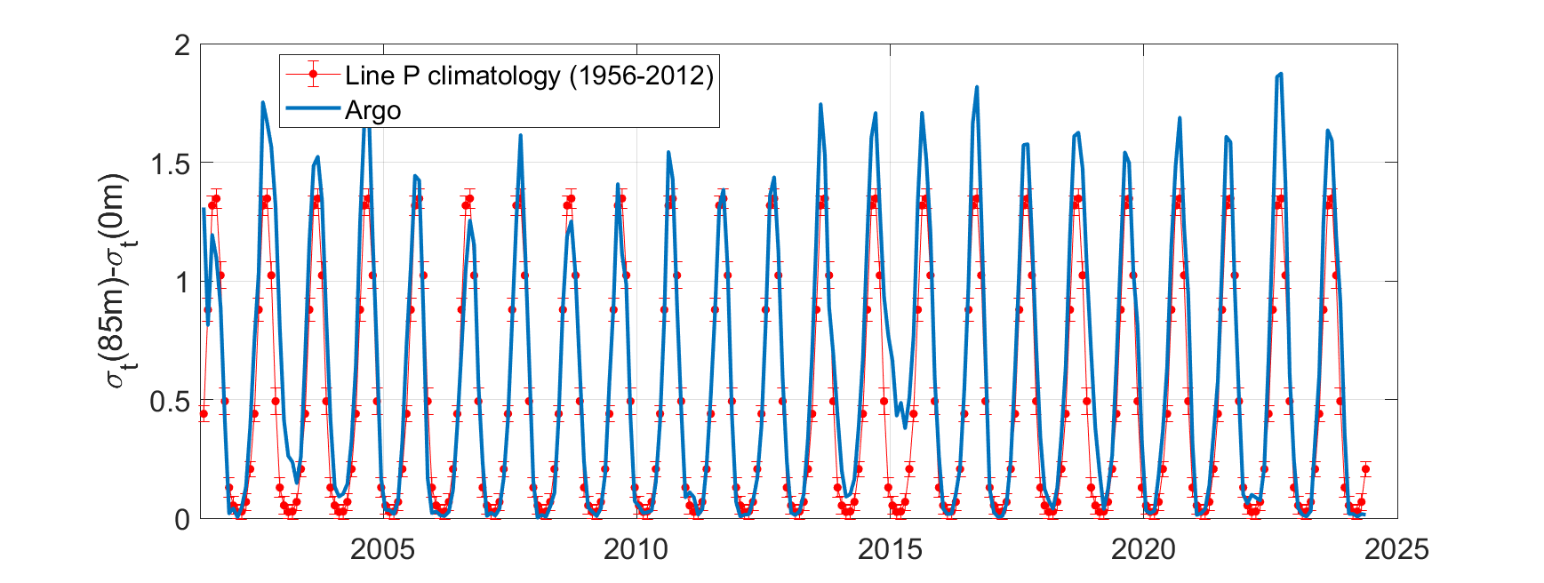 density anomaly (sigma-t) differences between 75m depth and the surface